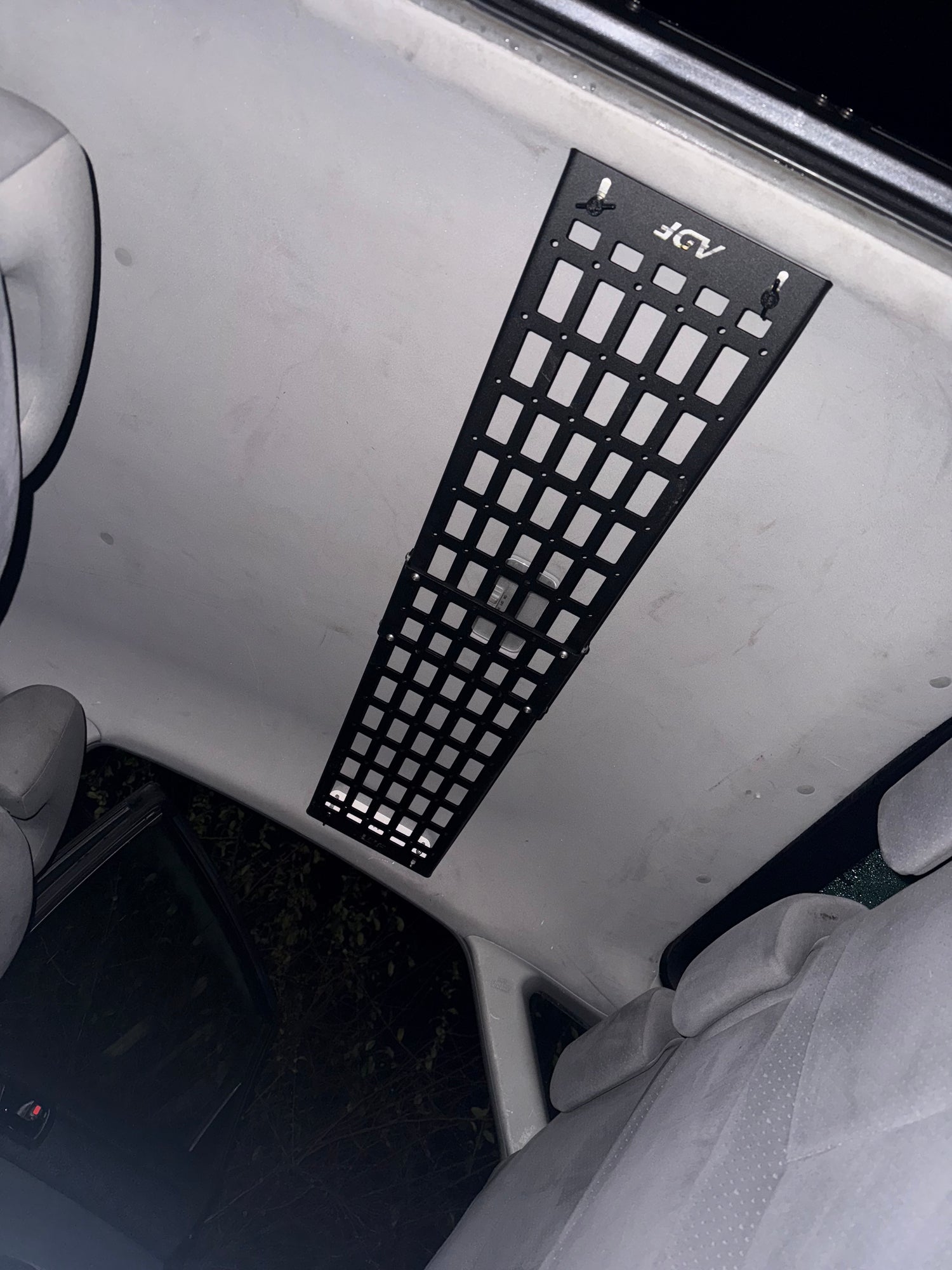Positioned smartly overhead, above the rear seat passengers, the racks stretch from one grab handle to the other. This innovative placement leverages previously underutilized space, making it a key storage area while ensuring that your tools and equipment are easily accessible.