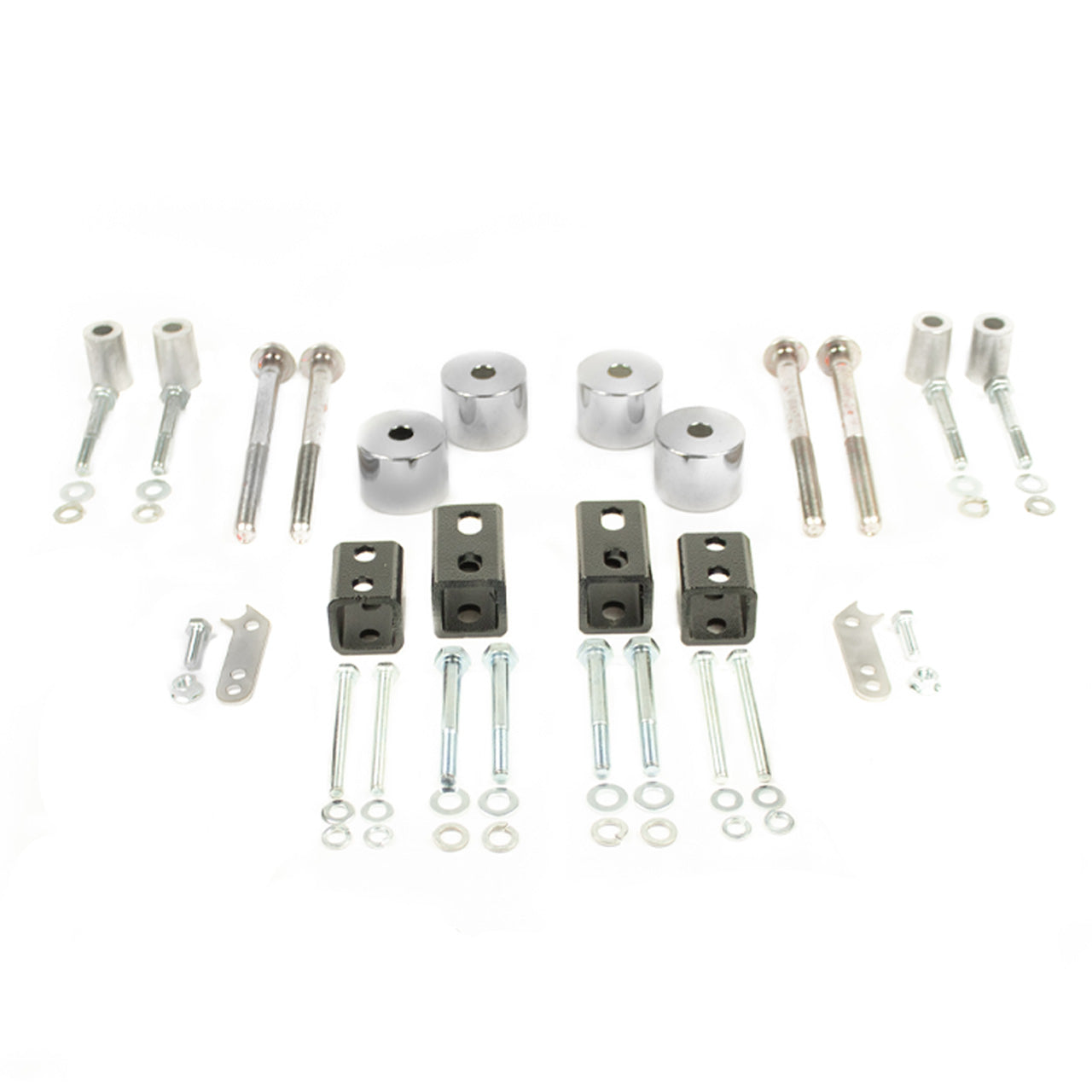 Crafted from 1/4" steel, the multi-link spacers are formed and TIG welded to create a sturdy 5-sided box. Unlike other companies, our mounting system utilizes a 2-piece bolt design, with the upper portion mounted to the chassis and the lower portion to the subframe.