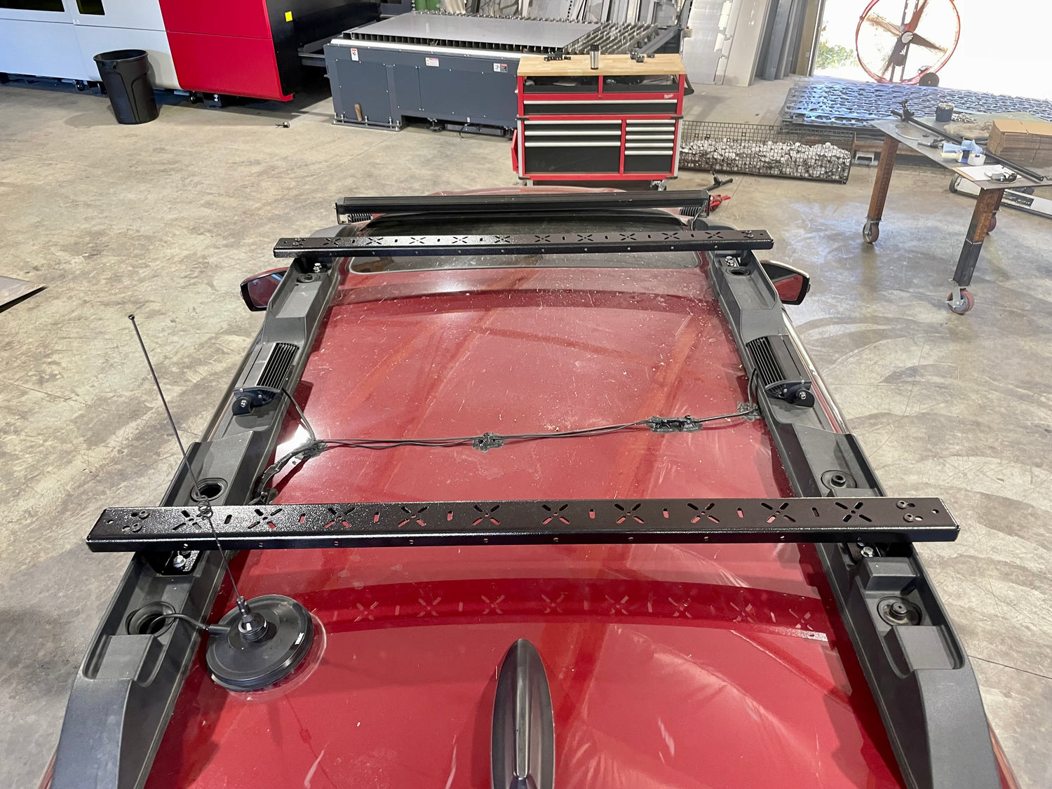 Main Crossbars are manufactured from 1/8" Steel and are CNC formed. 46" of Usable Crossbar. Mounting brackets are 1/4" formed Steel. Reliable and strong.